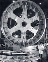 A collection of large components in the Richmond works. These include a girth gear for a ball mill, portions of the braking system for a mine winder.